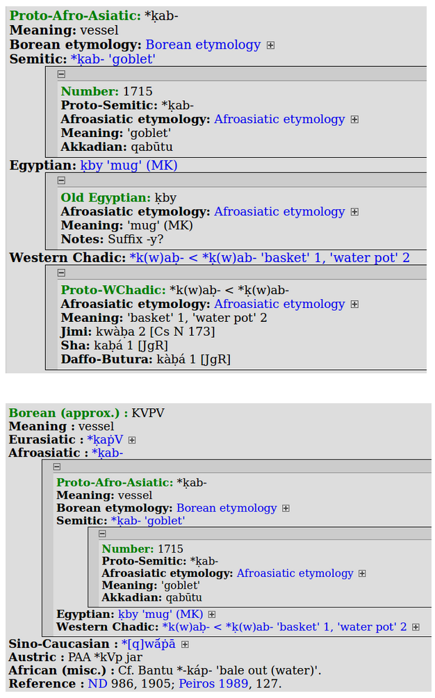 Partimos de la hipótesis de que la primera letra de la izquierda, mem, se corresponde con el final de una voz que podría estar en plural o bien corresponder a un nombre femenino; aunque, en cualquier caso, imposible de poder ni siquiera vislumbrar. Aclarado lo anterior, comenzamos nuestra identificación a partir de la siguiente letra, qop. Hallamos una raíz muy antigua, qp, bastante extendida en un gran número de lenguas afroasiáticas, y que se puede traducir justo como ‘vasija’, ‘jarra’, ‘olla’. Apenas existen otras voces con igual raíz que cobren algún sentido en un texto como este. Por lo que esta será mi primera propuesta, la hipótesis que considero probable. Antes aclaremos que las equivalencias fonéticas entre p/f/b son perfectamente viables y están bien documentadas.